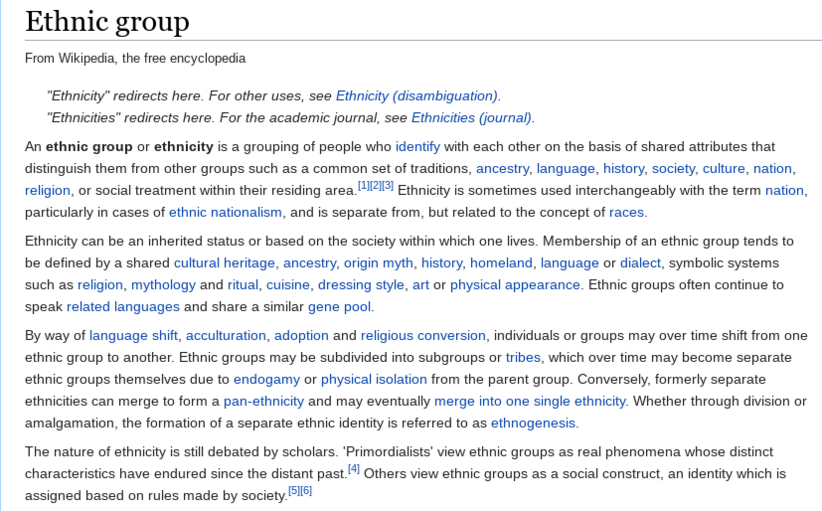 Per Wikipedia as a resource: (follow Link): https://en.wikipedia.org/wiki/Ethnic_group